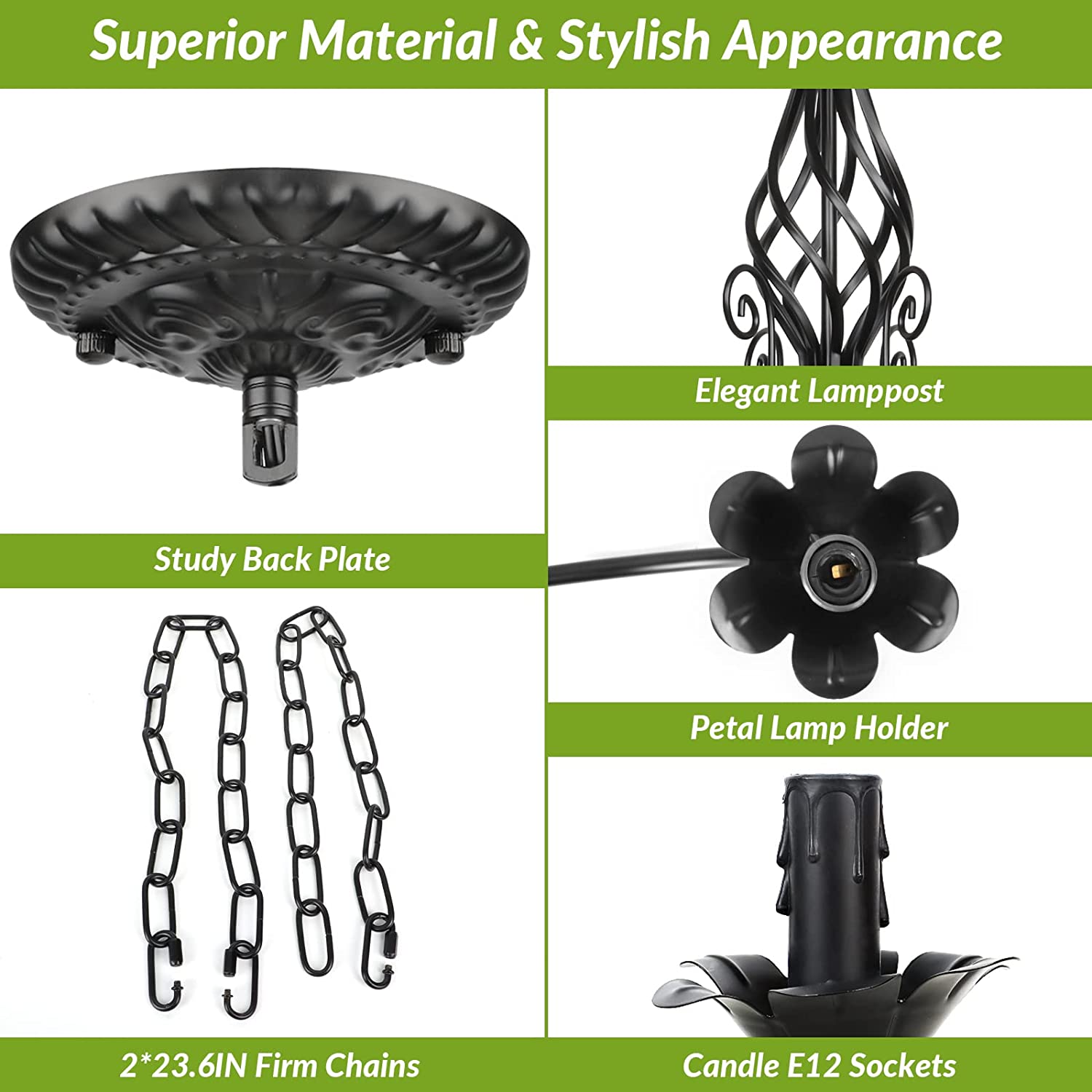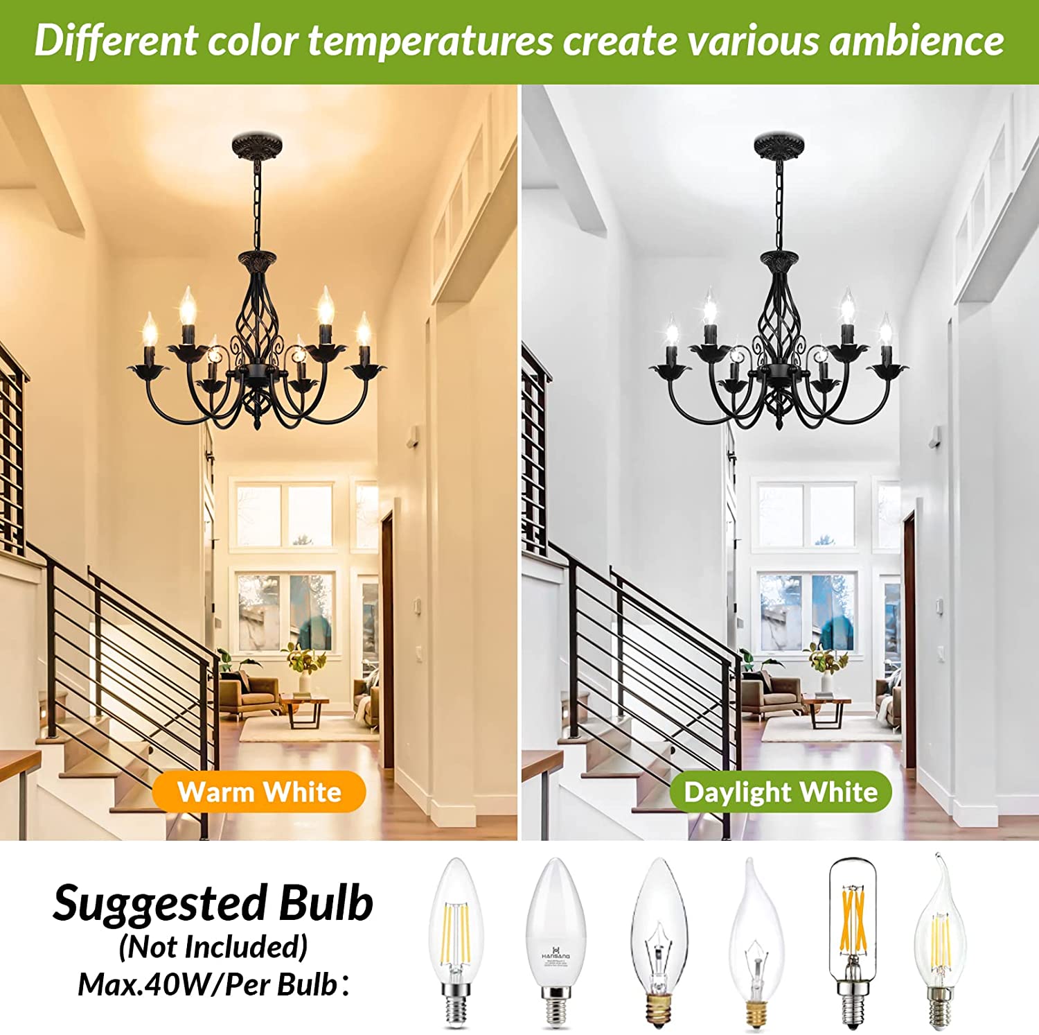 ✨【6 E12 Bulb Sockets】:6 E12 bulbs are required to the black chandelier light fixture, Max. 40W/per bulb. You can apply incandescent bulbs for vintage ambience and LED bulbs for modern effect, warm white glow creates welcoming, relaxed and soft atmosphere, daylight white bulbs brights clean and neat feeling. Just choose the bulbs according to your demand. (bulb is NOT included)
